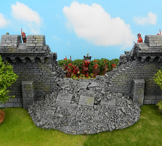 Wanting to do siege games my friends and I bought the old Games Workshop "mighty fortress" kit, injection moulded in styrene. The whole thing was constructed but only painted up in a basic way, so I didn't think it was particularly worth photographing. However, you you used to be able to buy separate wall and tower sections, so I went to some trouble to model a breeched wall section, as seen here. The painting isn't really up to the standard of the modelling, because it wouldn't have matched the rest of the structure. I built the broken wall as masonry outer faces with a rubble filling, the way massive walls are commonly constructed.